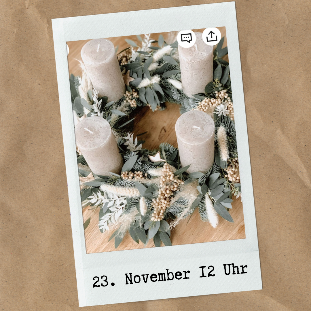 Gemeinsam gestalten wir einen Kranz, der durch klare Linien, natürliche Materialien und dezente Farben besticht. Das Highlight: ein elegantes Windlicht, das den Kranz auf besondere Weise zum Leuchten bringt und deinem Adventstisch einen modernen und gleichzeitig gemütlichen Charakter verleiht. Ob als Herzstück für dein Wohnzimmer oder als besonderes Geschenk – dein individuell gestalteter Kranz wird garantiert zum Blickfang.